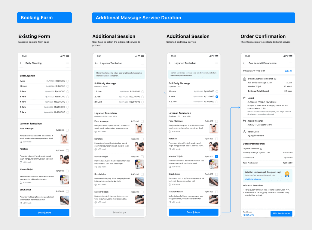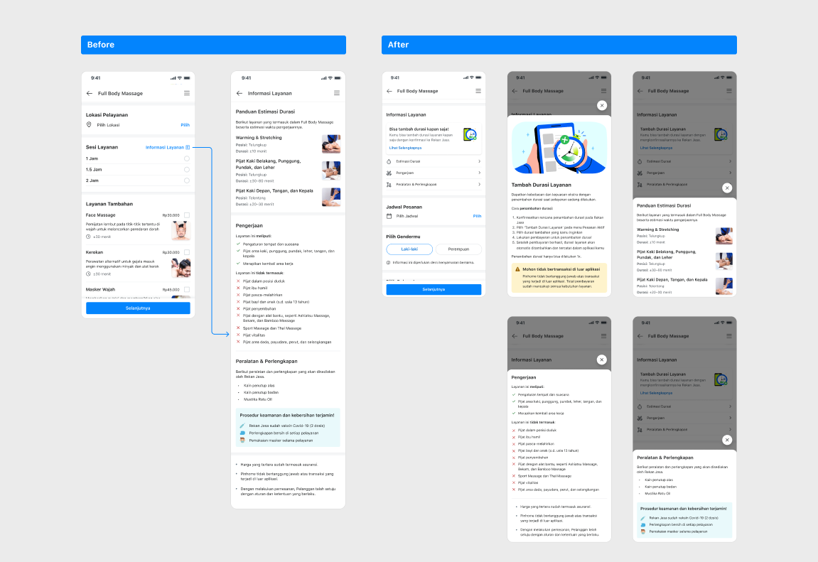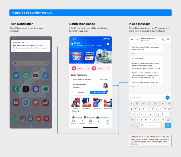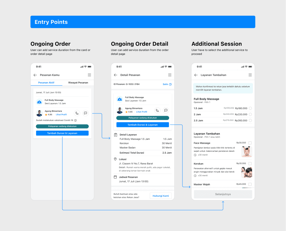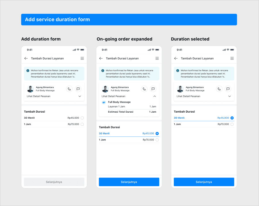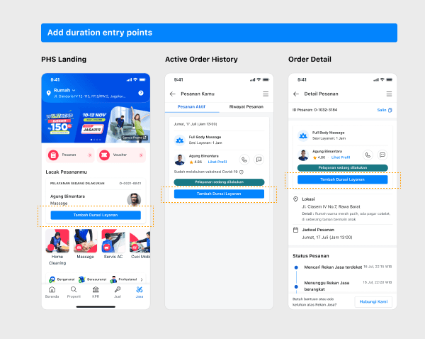 We assume when the order status is ‘Pelayanan sedang dilakukan’ and user wants to add the duration, their main focus will be on the On-going Order Tab or the order detail page, then we prepared the customer with 2 entry points to add the service duration: