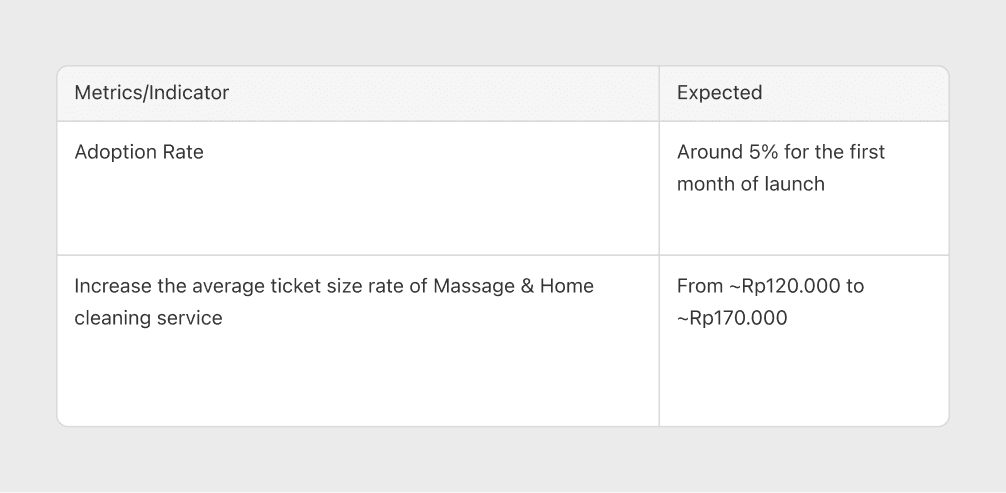 - With our organic effort where we haven’t pushed any marketing activity, the adoption of this feature is already reached the target with 5% of Total Completed Booking on Home Cleaning and Massage, with average ticket size to IDR 135k.